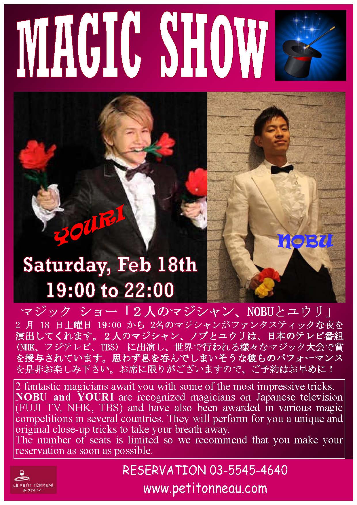 田代茂のマジカルワールド On Twitter 2月18日 土 19 30と20 30にル プティ トノー Le Petit Tonneau 虎ノ門店にて Nobuとユウリのパーラー ショーが行われます Https T Co Ccxrx0cp40 東京都港区虎ノ門2 1 1 商船三井ビル 1f 050 5872 3665 Https T